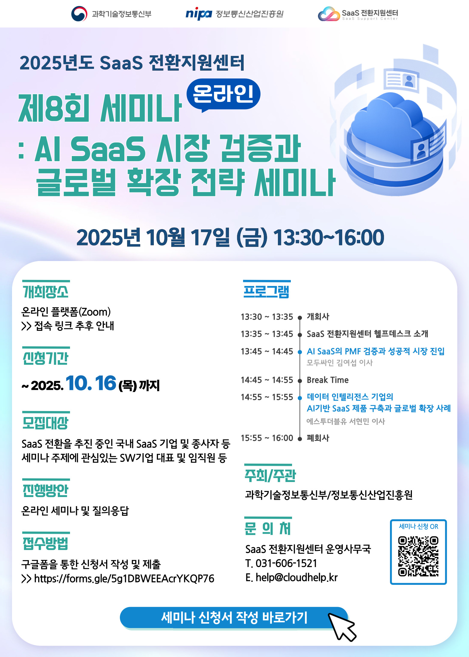 ※ 본 세미나는 '과학기술정보통신부'가 주최하고, '정보통신산업진흥원'이 주관하는 "2025년도 SaaS 창업⸱성장 지원(SaaS 전환지원센터 운영)" 사업의 일환으로 추진되는 프로그램입니다.