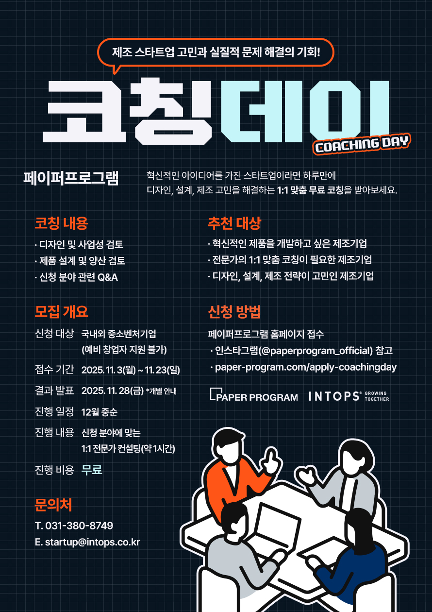 인탑스(주)가 운영하는 '페이퍼프로그램’은 하드웨어 스타트업이 제품을 시장에 성공적으로 출시할 수 있도록 기획, 디자인, 개발, IR 등 제조 전 과정을 함께 수행하는 협업 프로그램으로 하드웨어 스타트업을 위한 1:1 무료 컨설팅 ‘코칭데이’를 개최합니다. 코칭데이는 하드웨어 스타트업이 제품 디자인, 설계, 제조 등 다양한 분야에서 직면한 고민을 전문가와 함께 논의하고, 실질적인 해결책을 모색할 수 있는 기회를 제공합니다.