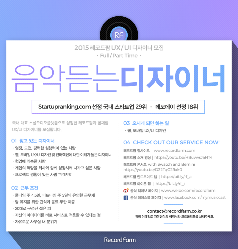 지원방법 - 공개채용으로 진행되며 이메일 접수를 통하여 지원하실 수 있습니다 (contact@recordfarm.co.kr) |